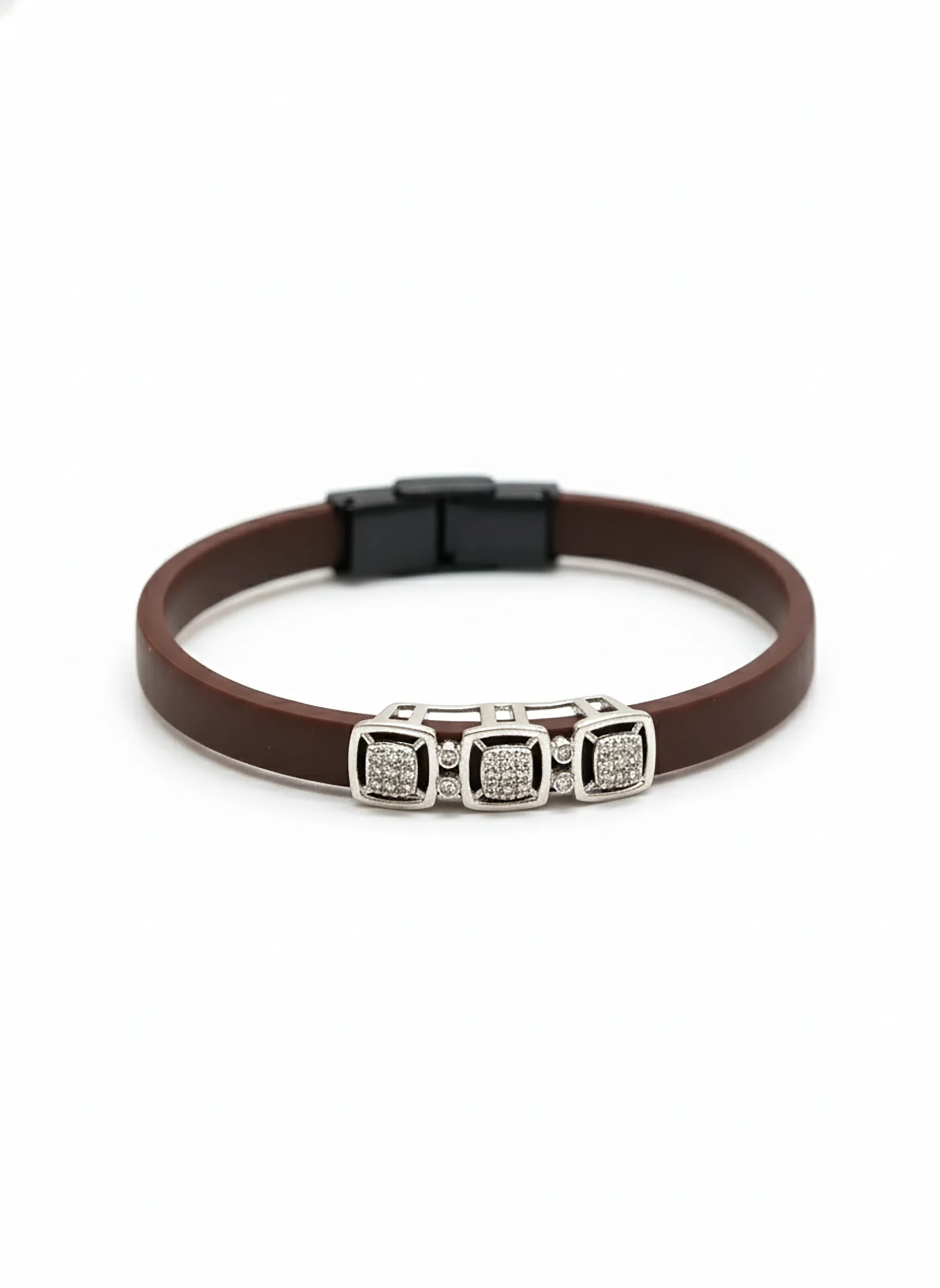 Silver Triple Square Iced-Out Mens Silicone Bracelet